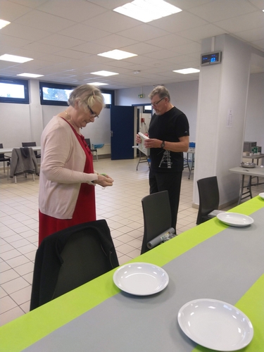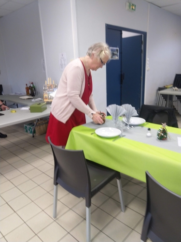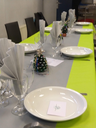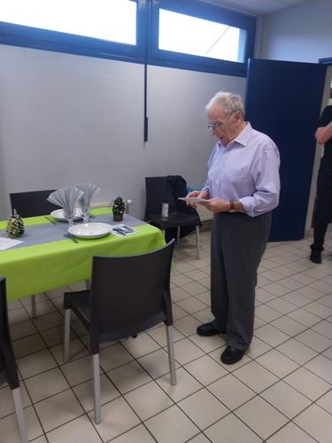 - Gérard, André, Marie-Jo et Mathias qui ont veillé à l’installation de la salle et de la cuisine. Un immense merci à Mathias qui nous a offert nappes, chemins de tables et serviettes. Merci à Marie-Jo pour les magnifiques décorations de table.