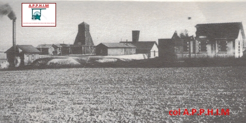 La Forge, à gauche, et la Salle des Machines au fond, vue depuis l'emplacement du puits. Le bâtiment de la machine porte le nom du puits et sa date de construction.On distingue également les trous pour le passage du câble d'extraction. Ce bâtiment sera malheureusement détruit quelques années plus tard.