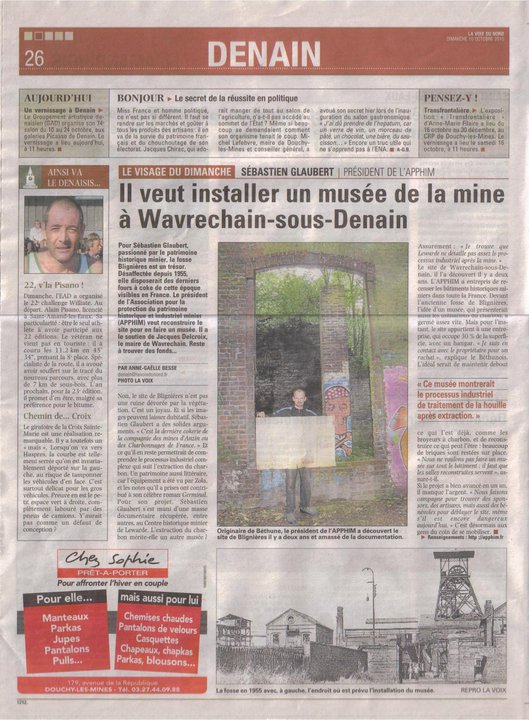 2009 Date de création : 03/04/2014 21:55 Catégorie : L'asso et ses actions - Revue de presse Page lue 8439 fois Généralités Partenaires Adhésion et dons Graines de Galibots Hommage de l'APPHIM aux morts du 10 mars 1906 Ecole Jules Ferry, Rouvroy Un grand mineur en maternelle Forum des associations à Courrières (62) Téléthon 2025 Banquet 2024 50ème anniversaire de la catastrophe de Liévin Banquet de Sainte Barbe 2025 L'épopée des gueules noires France 2 Vacances de Mineurs au 9/9bis Conférence SGN au CHM André de Marles 3 ans déjà! Norbert Gilmez, un mineur à l'honneur 76ème anniversaire de la grève de 1941 UNESCO, 5 ans, des sites en péril AG Université Populaire Mineurs du Monde Journées européennes du patrimoine à la fosse 9 Noeux les Mines pendant la grande guerre Assemblée Générale ACCCUSTO-SECI Sainte Barbe à Sains en Gohelle Commémoration Liévin 1974 Catastrophe ferroviaire de Thumeries Inauguration maquette cokerie Drocourt Disparition d'Olivier KOURCHID Exposition archéologie minière au 9/9bis Remise en route des machines du 9/9bis Commémoration Liévin 2018 Rue basse, rue haute Exposition 170 ans des Mines de Lens Exposition Le point du jour L'association Bassin Minier Patrimoine Mondial du Nord Mines de Ligny les aires Mines de Béthune Mines de Liévin Mines de Lens Mines de Courrières Mines de Drocourt Mines de Dourges Mines d'Ostricourt Mines d'Aniche Mines d'Anzin Mines de Vicoigne La Lorraine La cokerie La centrale thermique Cartographie Catastrophe de Courrières Installations minières Matériel du mineur Mines de l'Escarpelle Listing des mineurs de nos archives Préambule Productions par fosses Productions par groupes Le musée de la mine de Noeux les Mines (62) Le musée de la mine d'Auchel (62) Le musée de la mine de Bruay (62) Musée de la mine du Molay Littry (14) La maison du mineur La Grand Combe (30) Le pôle historique minier Gréasque (13) Musée du puits Couriot-Musée de la Mine de Firminy (42) Le musée de Lewarde : Centre Historique Minier (59) Les musées de Brassac les Mines et le puits des Graves (63) Musée Marcel Maulini Ronchamp (70) Le musée de la mine de Grande Synthe (59) Musée de la Mine de Buxières (03) Musée de la Mine Saint Eloy (63) Musée de la Mine de Messeix (63) Musée de la Mine La Machine (58) Musée de la Mine Blanzy (71) Musée de la mine d'EPINAC (71) Musée Mines de Fer d'Anjou (49) Musée de la Mine-Image de la Motte d'Aveillans (38) Le musée de l'école et la Mine de Harnes (62) Assemblée générale du 14/04/2015 Assemblée Générale 28/03/17 Exposition "il était une fois le 21" Ag 2018 des amis du Musée de l'Ecole et de la Mine Exposition "quoi de neuf au 9?" Si les cartes murales pouvaient parler Le musée Jean le Mineur (03) 2016, une présidente au musée Visite du musée Visite du Trésorier APPHIM Le musée de la Mine-Image (62) Portes ouvertes le 12/06/2014 Listing des archives Archives photographiques Listing des vidéos et autres Listing du matériel Planches d'exposition (hors expos APPHIM) Bruits de fond Bruits et lumières Lampe au chapeau Equettes Echos-mine Notre Mine-nuit et jour-équettes Nuit et jour Notre Mine Lumières sur la mine Tout venant Douai Mines Douai Minimes Coups de pic, coups de plume Relais Mineurs de France CdF Mag Notre Mine-Nuit et jour Tout Venant-Lumières sur la Mine Gazette de la potasse-Potasse magasine Gauhéria et Ferrovissime Rail et Industrie Broken Hill La catastrophe de Marcinelle Coup d'eau à la grande Bacnure (Belgique) En 68, le français était aussi mineur de fond L'adieu tchèque au charbon 2009 2010 2011 2012 2013 2014 2015 2016 2017 2018 2019 2020 2024 Prévisualiser... Imprimer...