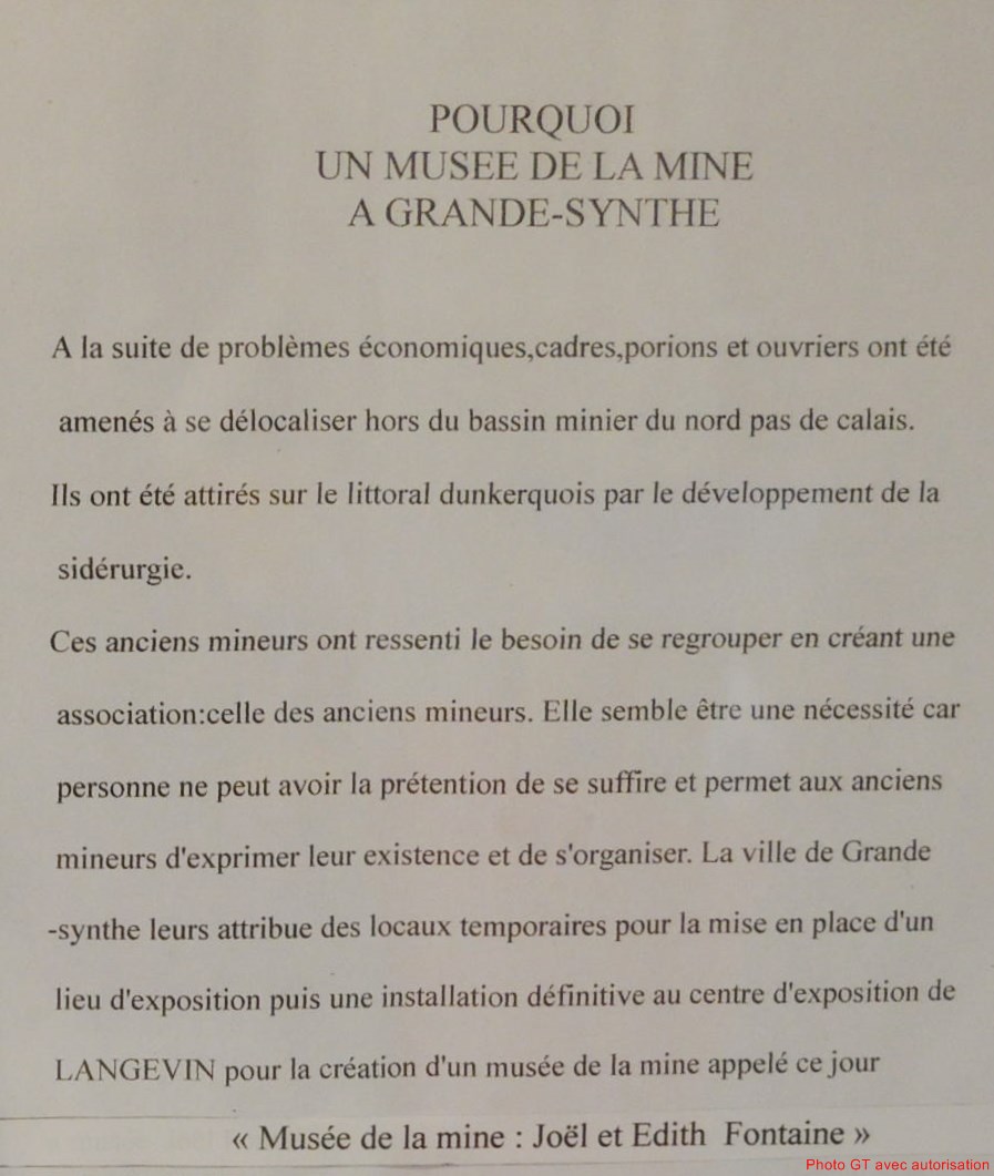 ̎Il y aurait un Musée de la Mine à GRANDE-SYNTHE à côté de DUNKERQUE, à 100 km au Nord du Bassin Minier du Nord/Pas-de-Calais ̎. Voilà ce que Jean-Louis HUOT, Président de l’APPHIM, nous annonce un jour à la fin du mois de septembre 2015. Comme l’assemblée générale de notre association a lieu début octobre, on en parle avec les participants et Jean-Marie MINOT (invité d’honneur) confirme l’information : il y a effectivement un Musée de la Mine à GRANDE SYNTHE et il nous en dit le plus grand bien.