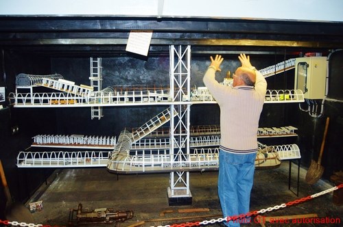 Dès l’entrée dans le bâtiment, on est ébahi par le travail qui a été réalisé par tous ces bénévoles. La grande salle est claire, colorée, magnifiquement agencée et même pour des habitués des musées miniers comme nous, il y a beaucoup de choses à découvrir. Le grand chevalement électrifié dont la cage effectue des va et vient entre les installations du jour et les galeries du fond (sous la grande table) est majestueux. Quel travail, c’est fou ! Nos trois amis sont aux anges car les questions que nous leur posons sont pertinentes et précises, ils sont fiers de nous renseigner. Même s’ils ont quitté la fosse depuis plus de quarante-cinq ans, on sent qu’ils sont encore dans l’atmosphère du fond ; leurs réponses sont précises, bien argumentées et pleines d’anecdotes, on se régale ! Sur les murs, des photos innombrables de chantiers d’exploitation, d’hommes au travail ou de machines avec des explications adjacentes, des schémas, des coupes de terrain, des tableaux offerts par des artistes-mineurs, des cartes postales, des affiches, etc… C’est clair, c’est bien classé et c’est pédagogique car les classes des écoles du Littoral défilent à longueur d’année dans le musée.