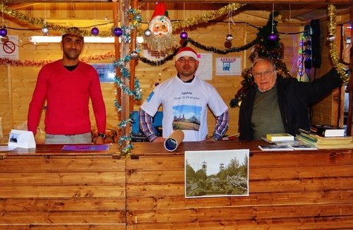 Beaucoup de monde comme chaque année au Marché de Noël de COURRIÈRES les vendredi 18 et samedi 19 décembre, il est vrai que la météo était très clémente. L’A.P.P.H.I.M occupait un stand mis gracieusement à sa disposition par la Municipalité. Jean-Louis HUOT, Georges TYRAKOWSKI, Jed BARKATI et Gérard BUSTIN ont aménagé le local aux couleurs de l’association et ont proposé aux visiteurs quelques articles à acheter (Relais, cartes postales, calendriers, livres) mais aussi quelques boissons chaudes bienvenues (café, ‘’jus de chirloute’’) et des sandwiches vraiment originaux (‘’casse-croûte traditionnel du Mineur’’, ‘’briquet chaud’’, ‘’pain d’alouette’’). Après le repas de Ste Barbe du 6 décembre, Jed a une nouvelle fois montré son savoir-faire de cuisinier et n’a pas arrêté de servir tous ces petits délices aux nombreux visiteurs attirés par des odeurs il est vrai très alléchantes (comment résister ?) ; toutes et tous ont bien apprécié les préparations originales de l’ami Jed. Les bénéfices de ces deux journées serviront à acheter du matériel (livres, documents, outils, logiciels …) et à organiser nos expositions qui devraient encore être nombreuses en 2016.
