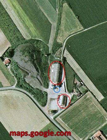 En rouge ; bâtiments visibles. En bleu : emplacement du puits 3