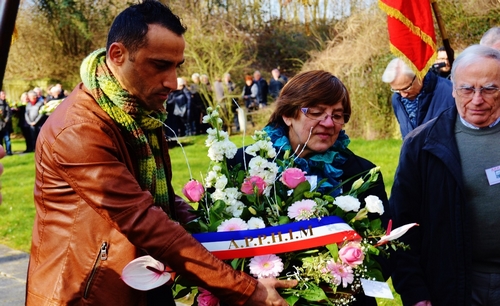 Jed BARKATI, Josiane DARLEUX et Gérard BUSTIN déposent la gerbe de l’APPHIM. Photo GT