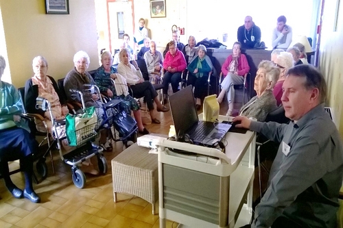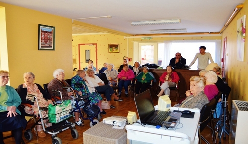 Georges TYRAKOWSKI, Secrétaire général, leur a ensuite commenté un diaporama d’une soixantaine de vues sur la catastrophe de COURRIÈRES dont c’était le 110ème anniversaire le 10 mars. Ce fut pour les résidents un moment de grande émotion car leurs parents ont vécu à l’époque de ce drame atroce qui a endeuillé toute la région. A la fin du diaporama, toutes les personnes présentes ont été invitées à chanter ‘’Les corons’’, l’hymne régional du Bassin Minier. De les entendre ainsi fredonner, les larmes aux yeux, les paroles de cette magnifique chanson nous donne envie de recommencer l’expérience. Les mamies sont toutes venues nous remercier à la fin pour ce moment de recueillement sur la vie des Mineurs et pour les bons souvenirs de leur jeunesse que nous avons ravivés en elles. En ce qui nous concerne, nous sommes très satisfaits car nous ne nous attendions pas à une telle participation des résidents, ce fut une rencontre intergénérationnelle vraiment très enrichissante pour tous.