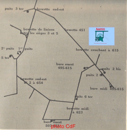 -Les bures Midi et Ouest 495-615 au siège 2 sont foncés par une nouvelle méthode avec évacuation par l'étage inférieur. Des trous de sondes ont été foncés puis un avant-trou de 813 mm par lequel les produits sont évacués.