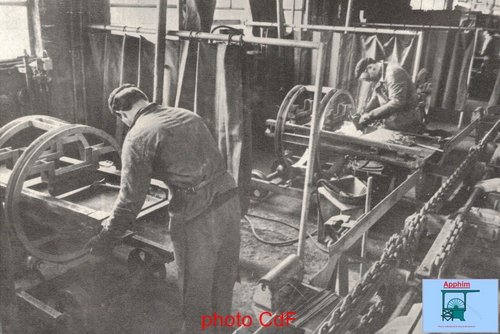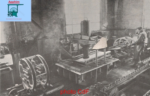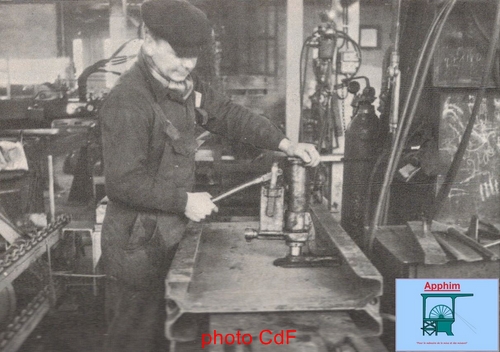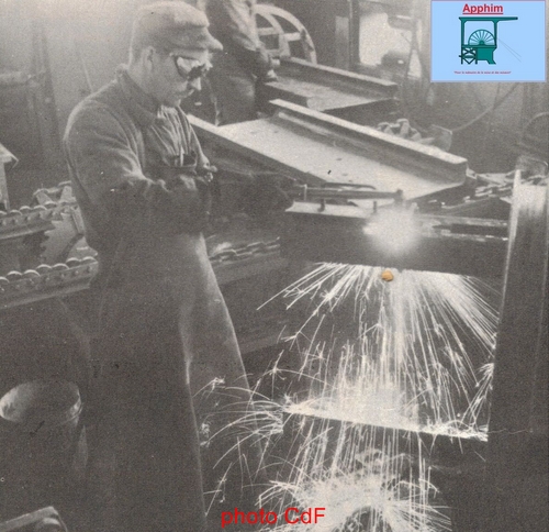 -Le pointage : Le bac est placé en position pour permettre aux deux ouvriers du poste de pointer les pièces de rechange entreposées dans des casiers. Avec une meule, les parties traitées au découpage sont rectifiées et dressées. Les pièces de rechange sont placées grâce à des calibres munis d'aimants. Il reste à pointer la pièce avec une soudure à l'arc électrique. Ce poste est muni d'une cheminée d'aspiration des gaz du pointage.