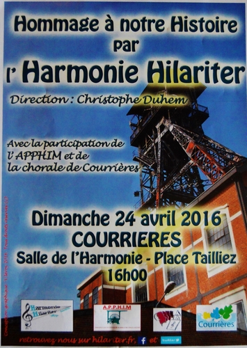 Après une première partie toute instrumentale où nous étaient successivement proposés Corolian de BEETHOVEN, La suite n°1 en mi bémol d’HOLST, La virgen de la Macarena de MONTEVERDE et CALERO, The seventh night of july de SAKAI, Cats de WEBBER et un hommage à COUNT BASIE, les spectateurs ont eu droit quelques morceaux chantés par la Chorale et animés en vidéo-projection par l’APPHIM : Le p’tit quinquin d’Alexandre DESROUSSEAUX, Septentrion d’Eugène GAUDEFROY, Chansons du Pays d’Artois de Marcel LEGAY, Symphonie pour Germinal de Jean-Jacques LECLERCQ, Le Grisou de R. BEAUMEZ, Courrières fleuri de Jean-Lucien GRUSON, Tout in haut dech terril d’Edmond TANIÈRE et enfin Les Corons de Jean-Pierre LANG immortalisé par Pierre BACHELET et repris en chœur par le public. Un bien bel après-midi et un partenariat que nous ne manquerons pas de renouveler. Beaucoup de spectateurs ont découvert l’APPHIM et nous avons enregistré quelques adhésions, ce qui était aussi l’un des objectifs de l’opération.
