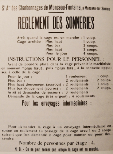 Quand on examine le tableau belge, on conçoit fort bien que, dans le bruit ambiant qui règne autour du puits, certains signaux peuvent être mal entendus d’où l’usage du téléphone en cas d’incertitude ou pour confirmer les demandes. Autre particularité du puits n°I où a eu lieu l’accident : l’extraction se fait à plusieurs étages, ce qui complique encore le problème car tous les arrêts de la cage ne se font pas aux mêmes hauteurs (en France, il n’y a, en principe, qu’une seule recette du fond).