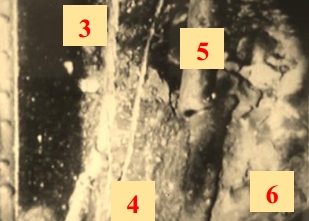1 : l’une des berlines coincées à 975, 2 : la poutre arrachée, 3 : cordon de sonnerie coupé, 4 : fils du téléphone coupés, 5 : conduite d’eau sectionnée, 6 : câbles électriques 600 V coupés.