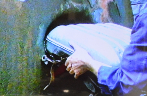Le matériel sur le dos du sauveteur ne passe pas dans le trou d’homme aménagé dans la bowette bouchée qui relie le puits III aux puits I et II. Toutes les photos du 2) prises sur la vidéo Marcinelle 20 ans déjà de la RTBF.
