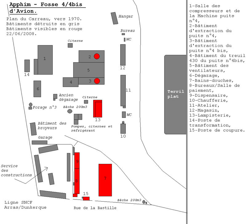 Il subsiste en 2016 les bains douches, la lampisterie, les bureaux, dispensaires, logement, du garde, la salle de paye et le poste de coupure.