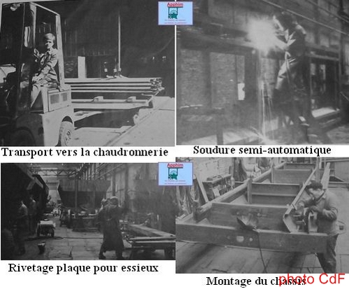 Les pièces sont emmenées de la chaudronnerie à l'atelier de montage. Les plaques de garde dans lesquelles coulisseront les essieux sont rivetées au moyen d'une machine pneumatique. Le châssis est assemblé.