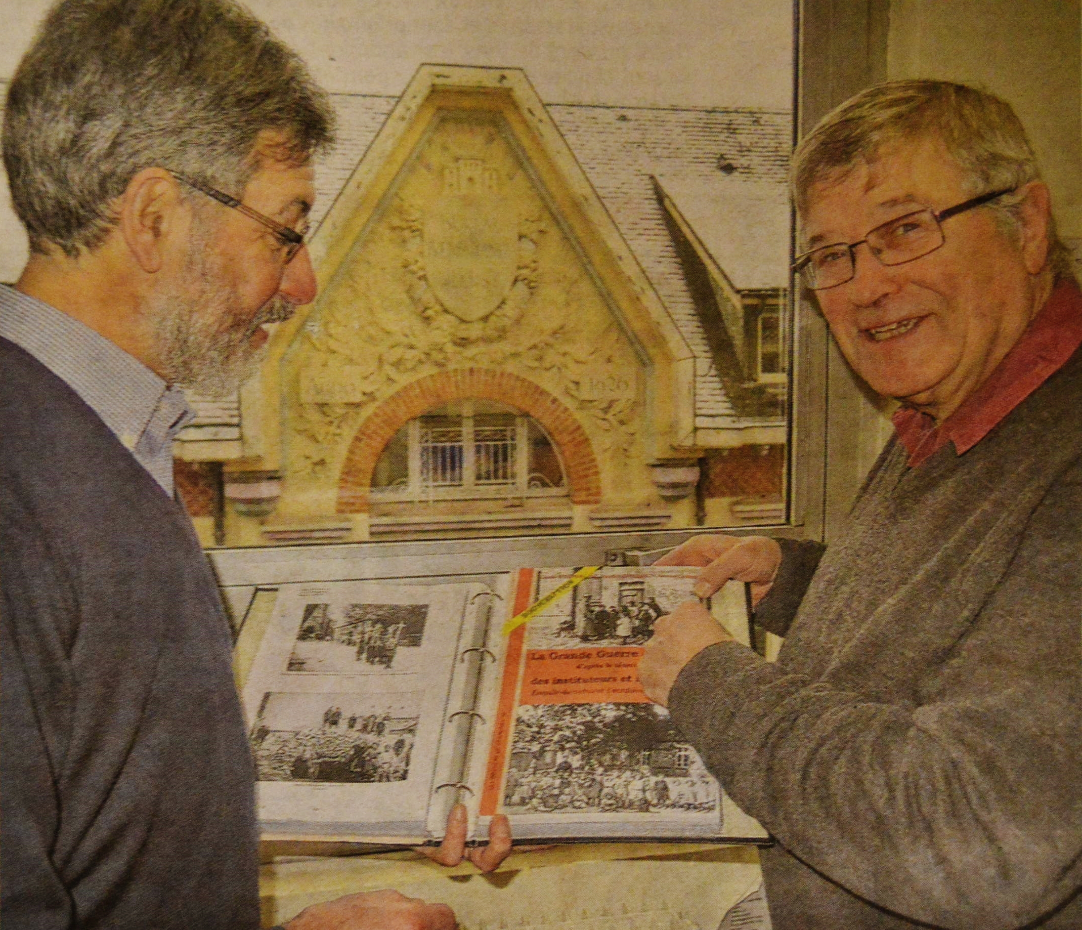 | Gérard BENDAHMANE et Bernard GHIENNE ne cachent pas leur fierté au moment de la sortie en 2015 de leur fantastique ouvrage de 416 pages rassemblant les témoignages des enseignants en zone occupée et en zone libre pendant le premier conflit mondial, des années de travail ! Photos la Voix du Nord et GT | |