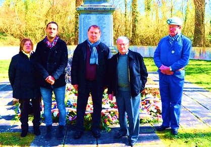 Gérard BUSTIN, André DIEU, Josiane DARLEUX, Daniel MILAN et Jed BARKATI amènent la composition florale de l’APPHIM au pied de la stèle. Photo GT