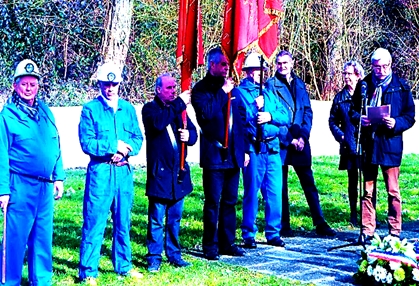 À la fin de la commémoration, les participants ont été conviés à une petite réception dans la salle Aimé Lambert voisine où Bernard BAUDE (Maire de MERICOURT), Bruno TRONI (Maire de BILLY-MONTIGNY) et Christian PEDOWSKI (Maire de SALLAUMINES) ont pris la parole. La délégation de l’APPHIM a eu le plaisir de faire connaissance et de discuter avec des amis lorrains qui ont fait le long déplacement dans le Pas-de-Calais: Eugène OGRABEK (de la mine-image de VELSEN) et Wiell VANASSCHE (administrateur du site des gueules jaunes) qui en ont profité pour aller voir ensuite notre exposition ‘’COURRIERES 1906, le parcours des rescapés’’ à la médiathèque François Mitterrand de COURRIÈRES. Un grand merci à ces deux passionnés de la Mine avec qui nous avons eu des discussions très intéressantes.
