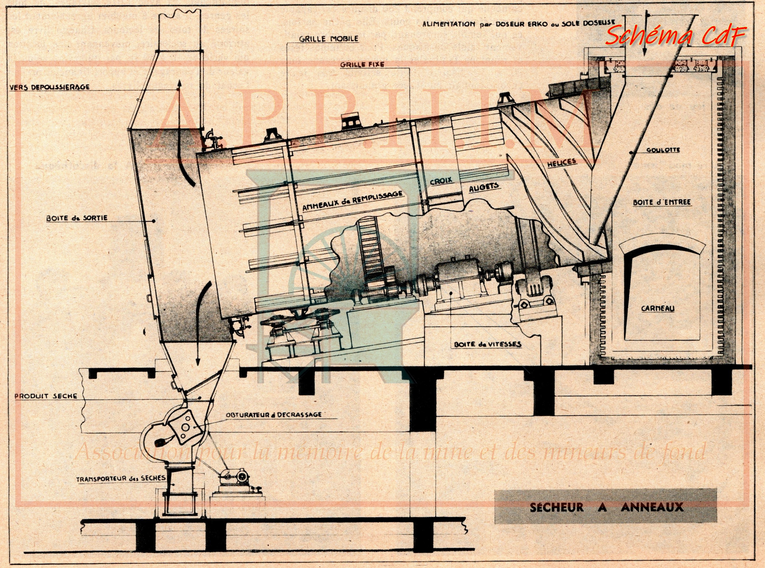 A l’entrée, par où arrivent les fines flottées filtrées humides et l’air chaud, des hélices sont chargées de foire avancer les produits. Des augets, espèces de tôles fixées à la paroi du tube, prennent le charbon dans le bas et le laissent retomber en fines poussières. Dans ce four sécheur, l’air, expédié en même temps que le charbon, est destiné à lui enlever son eau, c'est pourquoi on fait subir des manutentions au charbon dans le tube afin de le sécher complétement. Un croisillon divise le tube en 4 quartiers. Le charbon glisse ensuite à travers une épaisse cloison grillagée. Une autre cloison du même genre emprisonne 12 500 anneaux d'acier de 12 cm de diamètre - 12 cm de longueur - 3 mm d'épaisseur pesant ou total 15 tonnes.
