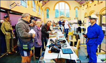 Au stand de l’APPHIM : ça discute à propos du matériel, ça recherche des Relais, des Équettes, des Tout Venant, … ça raconte des histoires de gosses de Mineur, ça se renseigne sur des ouvrages, ça négocie (à la baisse !) les tarifs des livres présentés, … C’est un plaisir d’échanger avec des gens passionnés (on se connaît tous) mais aussi de rencontrer de nouvelles personnes et c’est aussi l’un des objectifs du Mining. Photo GT