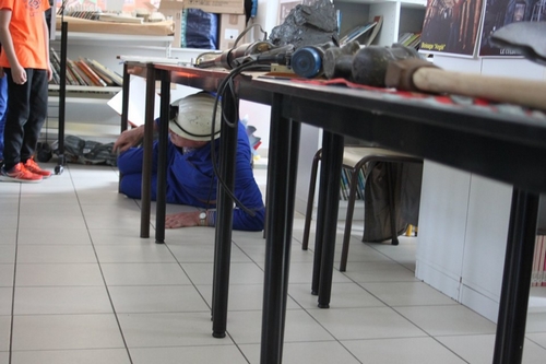 Outre ce jeu de questions-réponses, les jeunes galibots ont eu l’occasion de manipuler le matériel ramené par André et Gérard. C’est ainsi que les enfants se sont retrouvés à quatre pattes sous les tables avec barette et marteau-piqueur pour simuler le travail du mineur courbé dans son chantier d’abattage.
