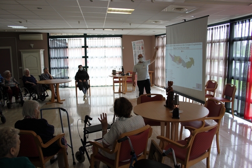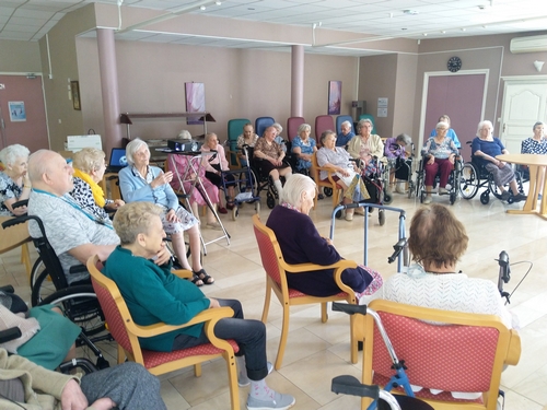 Le mercredi 14 avril 2021, à la demande de Jonathan Valembois, un des animateurs de l’EHPAD de Courrières, nous avons partagé un après-midi avec les personnes âgées résidentes de l’établissement. Malheureusement, à l’époque, seule une moitié des résidents avaient pu venir à notre rencontre. Nous avons donc fixé la nouvelle date d’intervention au 8 juillet.