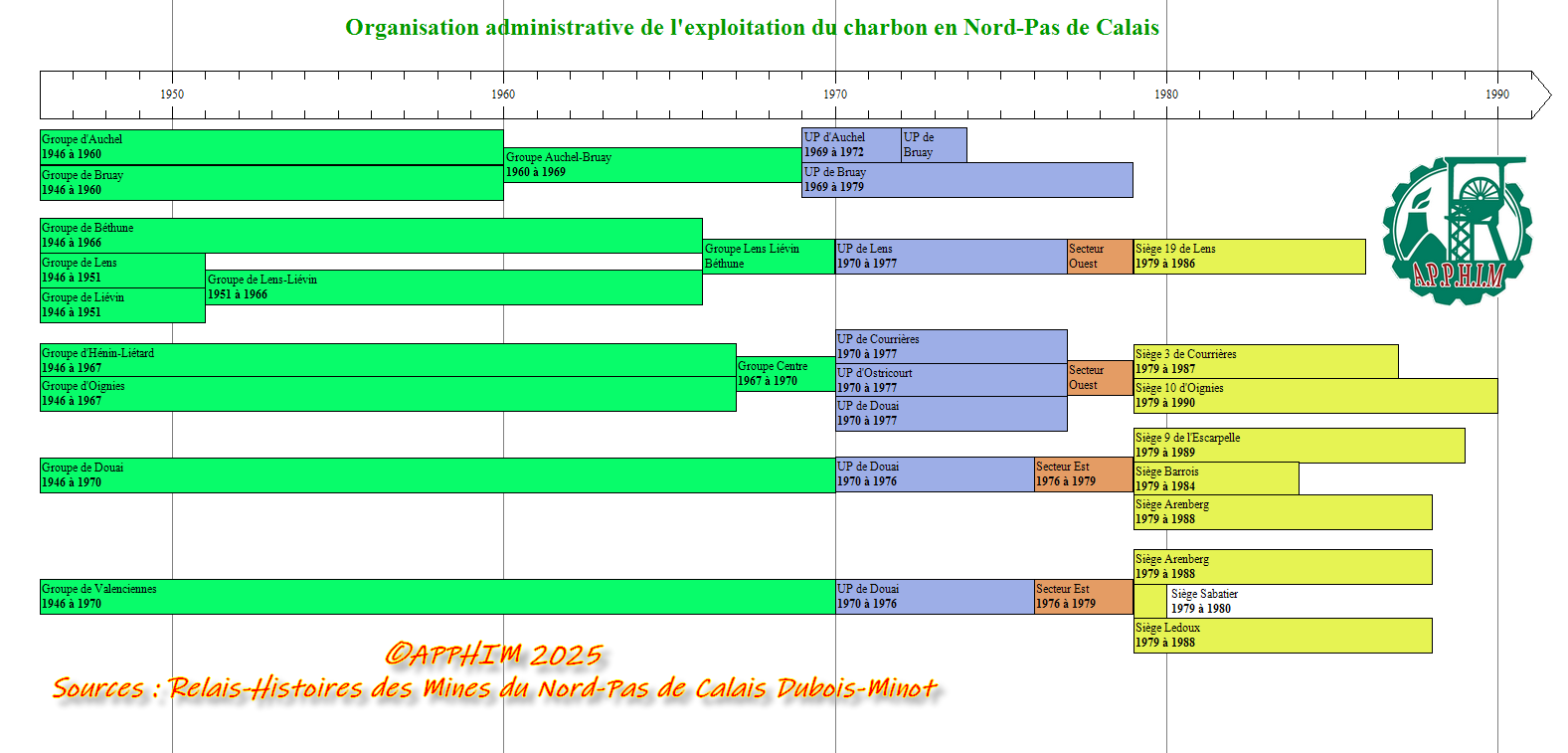 L'organisation administrative de l'exploitation après 1946 L'organisation administrative de l'exploitation du charbon Nord-Pas de Calais, après 1946 Cliquez sur l'image pour agrandir Jean-Louis HUOT pour l'APPHIM Mots-clés associés charbon Les gisements de charbon et ligniteLes concessions charbonnières en Bourgogne exploitation Les méthodes d'exploitationHavage intégral ou chambre à piliersHavage intégralLes traçagesL'aérageProduction et effectifsAndré DelacôteLes machines minières JOYLe séchageLe stockage des produitsL'expéditionTraitement thermique de la PotasseLes gisements de charbon et lignite nord pas de calais Le musée de Lewarde : Centre Historique Minier Date de création : 25/10/2025 09:31 Catégorie : Les sites miniers - Le bassin NPC Page lue 526 fois Les gisements de charbon et lignite Localisation des sites L'organisation administrative de l'exploitation après 1946 Nouvel étage 615 au 2 ter Double point de chargement au 6 Réparation des bacs de blindés aux Ateliers Centraux Réparation des équipages mobiles aux Ateliers Centraux Les concessions Localisation des sites la société de Fiennes et d'Hardinghen Liste des puits Avant propos ! Avant 1700 1700-1750 1751-1770 1771-1790 1791-1800 1801-1810 1811-1830 1831-1850 1851-1900 Après 1901 La fosse Elinghen Fosses non datées avant 1800 Fosses non datées après 1800 Fosses non datées La centrale électrique Localisation des sites La Compagnie Fosse 1 Avaleresse de l'éclaireur Fosse 2 Fosse 3 Fosse 4 ou avaleresse d'Auchy Terril 203 ou de Lières Terril 204 ou d'Ames Localisation des sites La Compagnie Fosse 2/2bis Fosses 3 et 3bis Terrils 31, 31bis et 32 ou Transvaal 1 Nord, Transvaal 2 Nord et Transvaal 2 Sud Terril 34 ou 3 de Ligny Terrils 35 bis et 35 ter ou 3bis de Ligny Localisation des sites La Compagnie Fosse 1/1 bis Terrils 244 et 245 ou Fléchinelle Ouest et Est Compagnie de Cauchy à la Tour Localisation des sites Les Mines de Ferfay La fosse 1 ou fosse Montebello Fosse 2/2 bis ou Fosse Lahure Fosse 3/3 bis ou Fosse Druon Fosse 4 ou Fosse Coubronne ou Fosse Saint Nicolas Terril 16 ou 1 de Ferfay Terril 19 ou 2 de Ferfay Terril 21 ou 3 de Ferfay Terril 30 ou 7 d'Auchel Terril 246 ou Cavalier 4 ter au 7 Les Mines de Marles Localisation des sites Fosse 2/2bis/2ter Fosse 3/3bis/3ter ou Fosse Saint Abel et Saint Firmin Fosse 4/4bis (4ter) ou Fosse Saint Emile ou Bois de Rimbert Fosse 5/5bis/5ter ou Fosse Saint Augustin Fosse 6/bis/6ter Fosse 7 Terril 4 ou 2 bis d'Auchel Terril 5 ou Bois de Lapugnoy Terril 8 ou 3 ter d'Auchel Terril 13 ou 3 d'Auchel Est Terril 14 ou 5 d'Auchel Terril 15 ou 6 d'Auchel Terril 20 ou de Rimbert 22 ou 2 bis d'Auchel ancien Ouest Terril 23 ou 3 d'Auchel ancien Ouest Terril 24 ou 4 d'Auchel Terril 223 ou Sablière Terril 228 ou Rivage de Marles Terril 231 ou Rivage de Béthune Le chemin de fer Travaux durant la guerre 14-18 Localisation des sites Fosse 1/1bis Fosse 2 ou Fosse Salonique Terril 33 ou La Clarence Localisation des sites Fosse 1/1bis Fosse 2 et fosse 2bis Fosse 3/3bis/3ter Fosse 4/4bis/4ter Fosse 5/5bis/5ter Fosse 6/6bis/6ter ou Fosse Marmottan Fosse 7/7bis Terrils 1/1bis ou 5 de Bruay Nord et Sud Terrils 2 et 3 ou 6 de Bruay Est et Ouest Terril 6 ou Bois de Lapugnoy Terril 7 ou 6 de Bruay Décharge Terrils 9/9bis ou 2 bis Ouest et Est Terrils 10/10bis ou 3 de Bruay Ouest et Est Terrils 11 et 12 ou Usines de Labuissière Est et Ouest Terril 17 ou 2 de Bruay Terril 18 ou 5 bis de Lillers Terrils 25/26 ou Falande 1 Sud et Falande 2 Nord Terril 27 ou Labuissière Aviation Terril 28 ou Fontenelle Terril 29 ou 5 de Bruay Est Terril 229 ou Décharge Falande Terril 241 ou Cavalier de la voie du 3 Terril 258 ou Sablière de la voie des dames Terril 259 ou Centrale électrique de Gosnay La cokerie Les lavoirs du siège 6 L'hôpital Sainte Barbe La cité des électriciens Naissance du chemin de fer Poste d'aiguillage Localisation des sites Fosse 1 des Mines de Vendin Fosse 2 des Mines de Vendin Fosse 1/1bis des Charbonnages de Vendin Fosse 3 taille 1 quartier 22° Nord Siège 4 taille 254 22ième veine Installation d'un transporteur au 6 16ième veine Nord Ouest fosse 4 bis Siège 3 22ème CR Le soutènement qui marche au siège 3 de Bruay Taille scraper Fosse 5 bis La recette du 6ter à 706m Raval du puits 5 ter Localisation des sites Fosse 1/1bis ou Fosse Aubé de Bracquemont Fosse 2/2bis ou Fosse Dupont Fosse 3/3bis ou Fosse Parsy Fosse 4/4bis ou Fosse De Comines de Marsilly Fosse 5/5bis ou Fosse Wallerand Fosse 6/6bis ou Fosse Davaine Fosse 7/7bis/7ter ou Fosse Bonnel Fosse 8/8bis ou Fosse Renard Fosse 9/9bis ou Fosse Warenghien La Fosse 10 et la Fosse 10bis La Fosse 11 et la Fosse 11bis Fosse 12 Terril 36 ou 1 de Noeux Terril 37 ou 8 de Noeux Terrils 38, 38bis, 38ter ou 7 de Noeux Est, Ouest et Nord Terril 39 ou 5 de Noeux Terrils 40 et 41 ou 4 de Noeux Ouest et Est Terrils 42,42bis, 43,43 bis, 43 ter, 43 quarter et 44 ou 3 de Noeux Sud, 3 de Noeux satellite Nord, 3 de Noeux Nord, 3 de Noeux Est, 3 de Noeux Ouest Terril 45 ou Nouvelles Usines de Noeux Terril 46 ou 6 de Noeux Terril 56 ou 8 de Noeux Terrils 57/57bis ou 6 de Noeux Sud et Cavalier du 6 Terril 60 ou 2 de Noeux Terril 61 ou Usines de Noeux Terrils 62, 62bis et 62ter ou Centrale de Beuvry Est, Remblai Centrale Beuvry et Cavalier de la Centrale Terril 66 ou 11 de Noeux Terril 232 ou Cavalier de Noeux Terril 237 ou Cavalier voie du 8 au 11 Terril 238 ou Cavalier voie du 5 au 7 Les centrales de Beuvry Le chemin de fer Travaux durant la guerre 14-18 Localisation des sites Fosse 1/1bis/1ter Fosse 2 Fosse 3 Fosse 4 Fosse 5/5bis Fosse 6/6bis Fosse 7/7bis Fosse 8/8bis Fosse 9 Fosse 10/10bis Fosse 11/11bis Fosse 12 Terrils 47-47bis ou Fosse 9 Ouest et Est Terrils 48 et 48 bis ou Fosse 4 Est et Ouest Terril 49 ou 3 de Béthune Terril 50 et 50 bis ou 7 de Béthune et Cavalier du 7 Terril 51 ou 6 de Béthune Terrils 52 et 52 bis ou 2 de Béthune Est et Ouest Terril 53 ou 1 de Béthune Terril 54 ou 11 de Béthune T